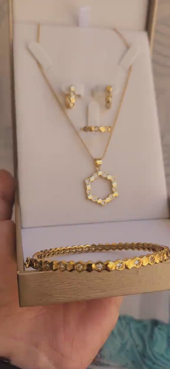 طقم متكامل: يشمل العقد، الأساور، الخواتم، والحلقان لإطلالة متناسقة.